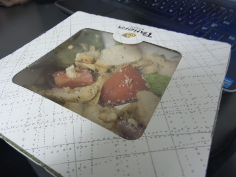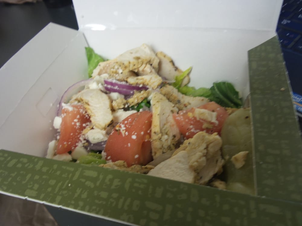 Romaine tossed in Greek dressing, topped with grilled chicken, grape tomatoes, feta, sliced cucumbers, red onions, kalamata olives, sliced pepperoncini peppers, salt and pepper.